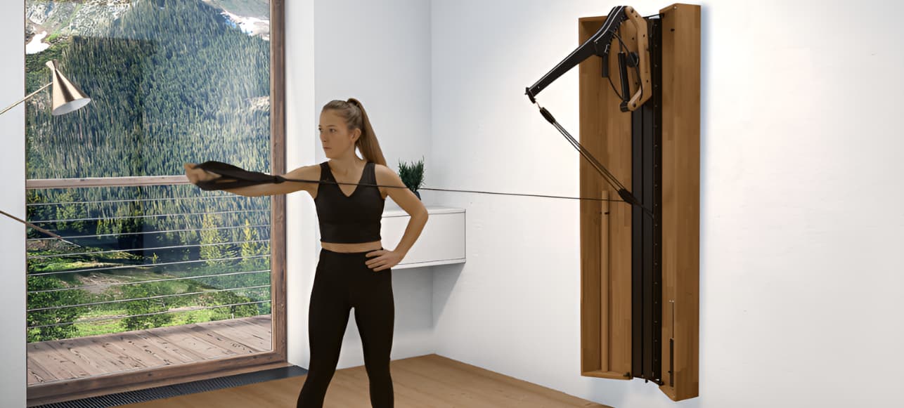 Stelle dich zwischen die Schlitten, nah an die Wand. Greife mit beiden Händen den Rücken des Horns (etwa auf Höhe der Gewichtsstufe 12). Drücke dich kontrolliert nach oben, bis deine Füße in der Luft überkreuzt sind. Lehne dich dabei leicht nach vorne.